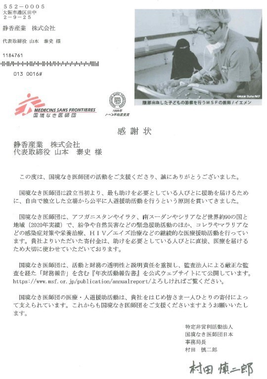 静香産業グループでは世界の問題解決を少しでも支援したいとの想いから「国境なき医師団」の活動を支援しています。支援に対し、国境なき医師団様より感謝状をいただきました。(2022年4月14日)